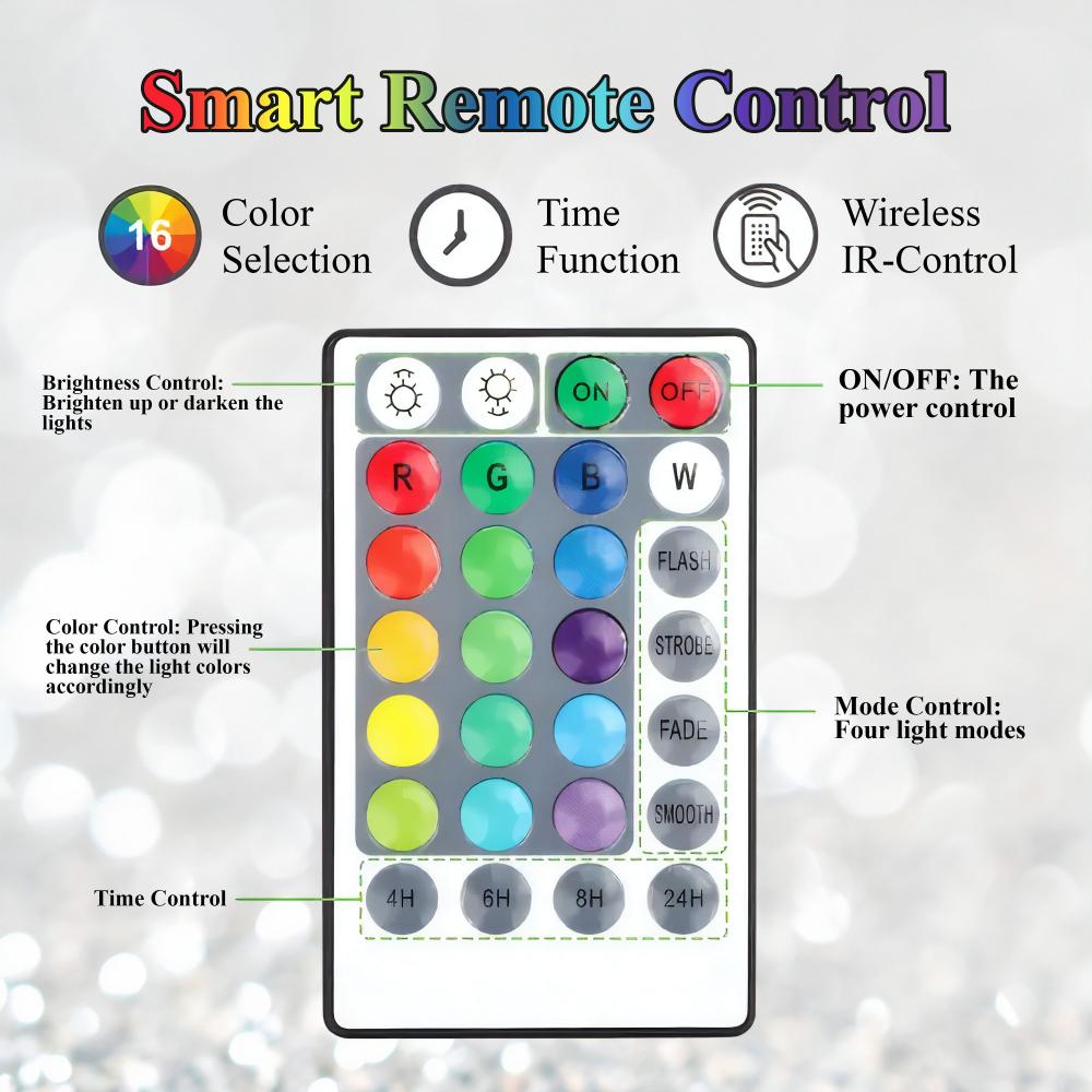 Remote control: You can use the remote to turn the lights on and off, 16 different color lights and 4 different light animation modes.